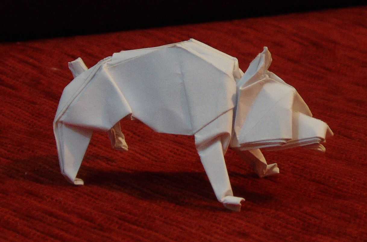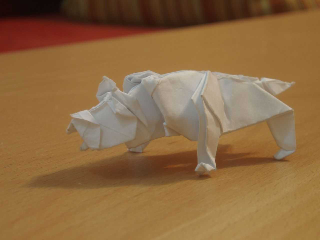 This model is the first trial of folding this dog from the crease pattern that should lead to a rhinoceros..